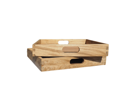 Deze handgezaagde dienbladen zijn compact en voor meerdere doeleinden geschikt. De bladen zijn afgewerkt met transparante witte olie.