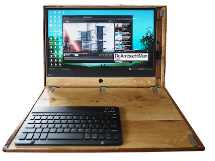 Een eikenhouten koffer met geïntegreerde computer en scherm.