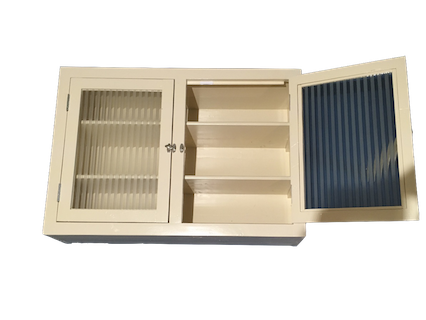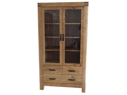 Samenstelling: de kast bestaat uit samengestelde planken die verbonden zijn met een penconstructie. Het frame is zelfdragend (dat geeft een maximale inhoud). De kastdeuren zijn ingelegd met figuurglas wat met glaslatten is vastgezet. De kast is in de verf gezet (2), of heeft - bij eikenhouten planken - een olie (3) of witte zeep afwerking en bij ipéhout een olie (3) coating.