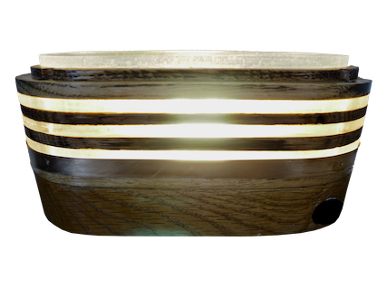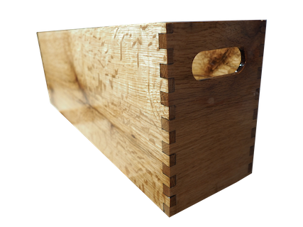 Samenstelling: een eikenhouten plank van 18mm is overlangs gezaagd tot latten van 9mm. De latten zijn op maat gemaakt en hebben daarna een tandverbinding gekregen. De bodem is op maat gemaakt en in het latten frame geplaatst. Het geheel is verlijmd.
