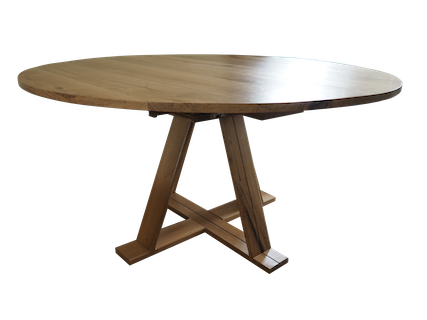 Een ronde massief eikenhouten tafel met een diameter van 150cm die kan uitschuiven tot 225cm.