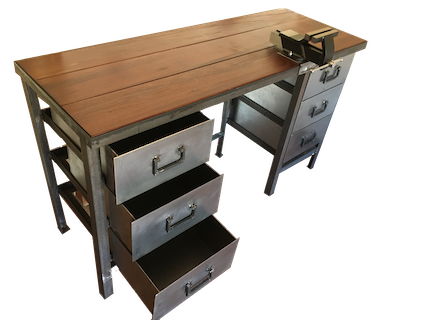 Materiaal: een gelast frame van hoekstaal van 4x4cm, 4mm dik waarin het bijzonder harde en slijtvaste (4cm dik) ipéhouten blad verzonken ligt. Laden zijn gemaakt van van 2 en 3mm plaatstaal met handgrepen van 8x8mm massief staafstaal.